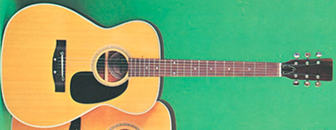 The 354 features a grand concert body shape with fine grained spruce top on chito-wood back and sides with black and white binding and high gloss finish. The round soundhole has a black and wood marquetry rosette and a black pickguard. The mahogany neck has a 20-fret rosewood fingerboard with pearl dot position markers. Components include a plastic saddle in an adjustable rosewood bridge with a pair of pearl dot inlays, a plastic nut, and chrome die-cast machine heads.