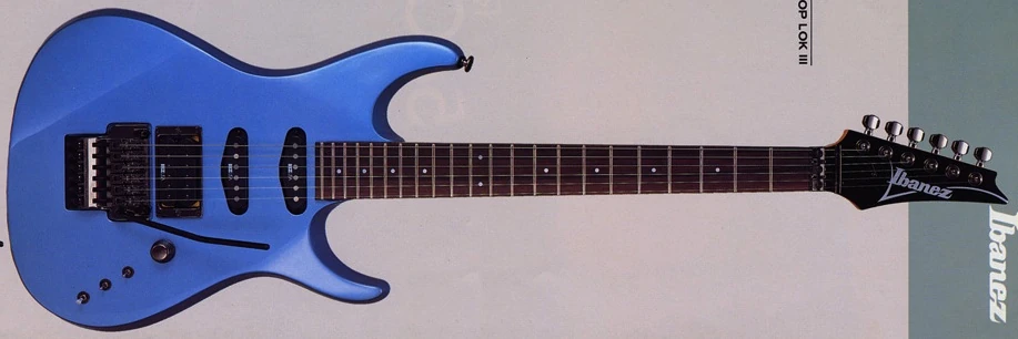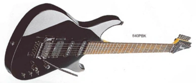 The 540P features an alder body bolted to a maple Wizard neck with a 22-fret rosewood fretboard with dot position markers. Components include DiMarzio built IBZ/USA pickups with a humbucker at the bridge and single-coils at the neck and middle positions, an Edge double locking tremolo bridge with a locking nut and Gotoh tuning machines.