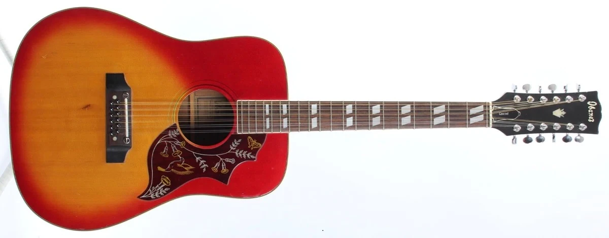 The 684/12 features a dreadnought body shape with a fine grained spruce top with binding on mahogany sides and back with a gloss finish. The soundhole is round with a simple black and white rosette and a ornate pickguard w/ hummingbird and flowers. It has a satin finished mahogany neck with a 21-fret rosewood fingerboard with pearloid parallelograms position markers. Components include a plastic saddle in an adjustable rosewood bridge with black Ibanez bridge pins, a plastic nut, and chrome tuning machines.