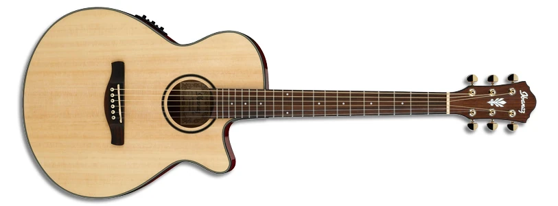 The AEG26Ⅱ features a thin grand concert shaped body with a soft Venetian cutaway. The top is laminated spruce with black and white binding on maple burl back and sides with a low gloss natural finish. The round soundhole has an acrylic rosette. It has a satin-finish mahogany neck with a 25" scale, 21-fret rosewood fingerboard with small white dot position markers. Components include a plastic saddle in a rosewood bridge, Ibanez Advantage bridge pins, a plastic nut, and gold Ibanez die-cast tuning machines. Electronics consist of a Fishman Sonicore pickup connected to an Ibanez AEQ210TF preamp with onboard tuner powered by a 9V battery and ¼" stereo output jack.