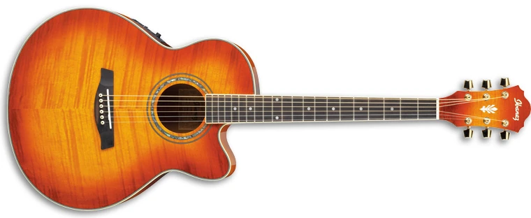 The AEL20E sold outside the US features a jumbo-sized body with a Venetian cutaway constructed of a laminated flamed sycamore top on laminated maple sides and back mated to a mahogany neck with a 20-fret rosewood fingerboard with pearloid dot position markers. The soundhole is round with an abalone rosette. Common components include a compensated Ivorex II saddle in a rosewood bridge with Ibanez Advantage pins, an Ivorex II nut, and gold Ibanez Smooth Tuner AS tuning machines.