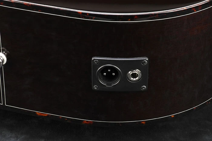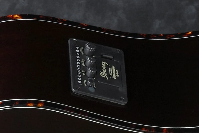 Electronics consist of a Fishman Sonicore pickup, an Ibanez AEQ-SP2 preamp with onboard tuner powered by a 9V battery and balanced XLR and ¼" outputs.