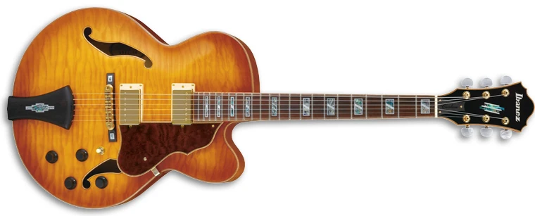 The AF125 features a full-hollow body design with a quilted maple top with ƒ holes and flamed maple binding on quilted maple back and sides with a single Venetian cutaway mated to a set-in maple and walnut neck with a 20-fret rosewood fingerboard with flamed maple binding and pearl and abalone custom block position markers. Components include a pair of Ibanez Super 58 humbucking pickups with gold covers and individual volume and tone controls, a Tune-o-matic style bridge on a wooden base and a tailpiece with custom wood cover, a plastic nut, a quilted maple pickguard with brown finish, rosewood bell-shaped knobs, and Ibanez die-cast tuning machines with white half moon buttons.