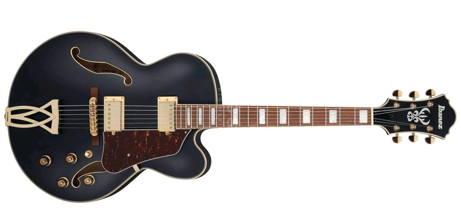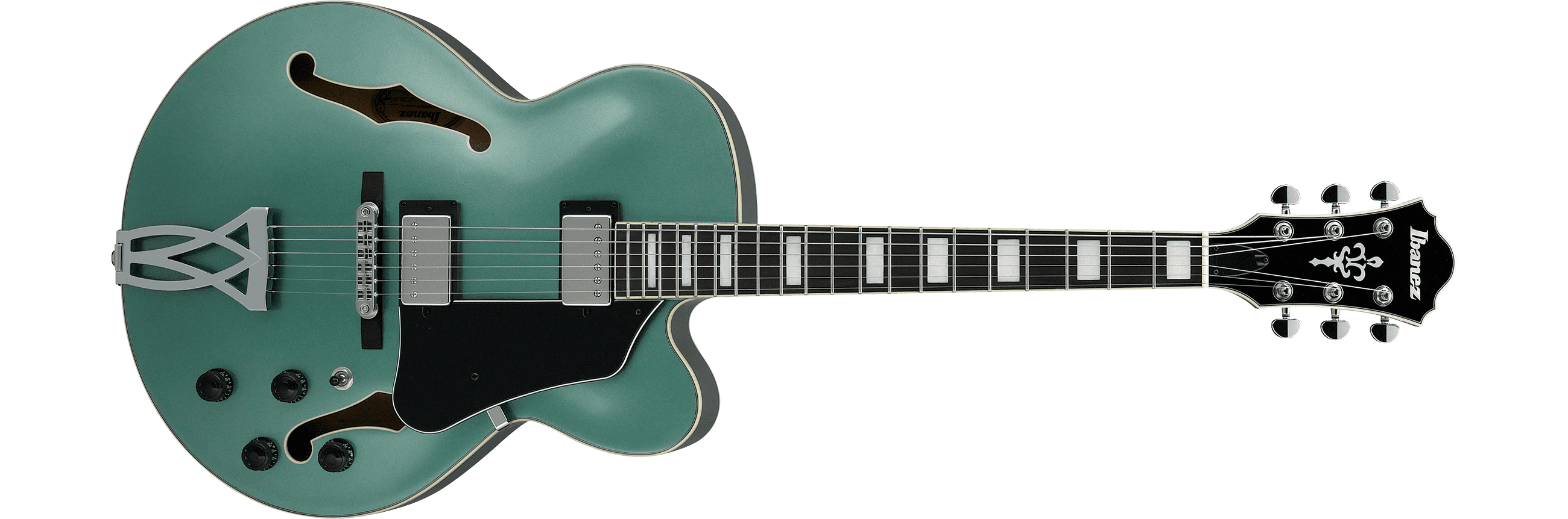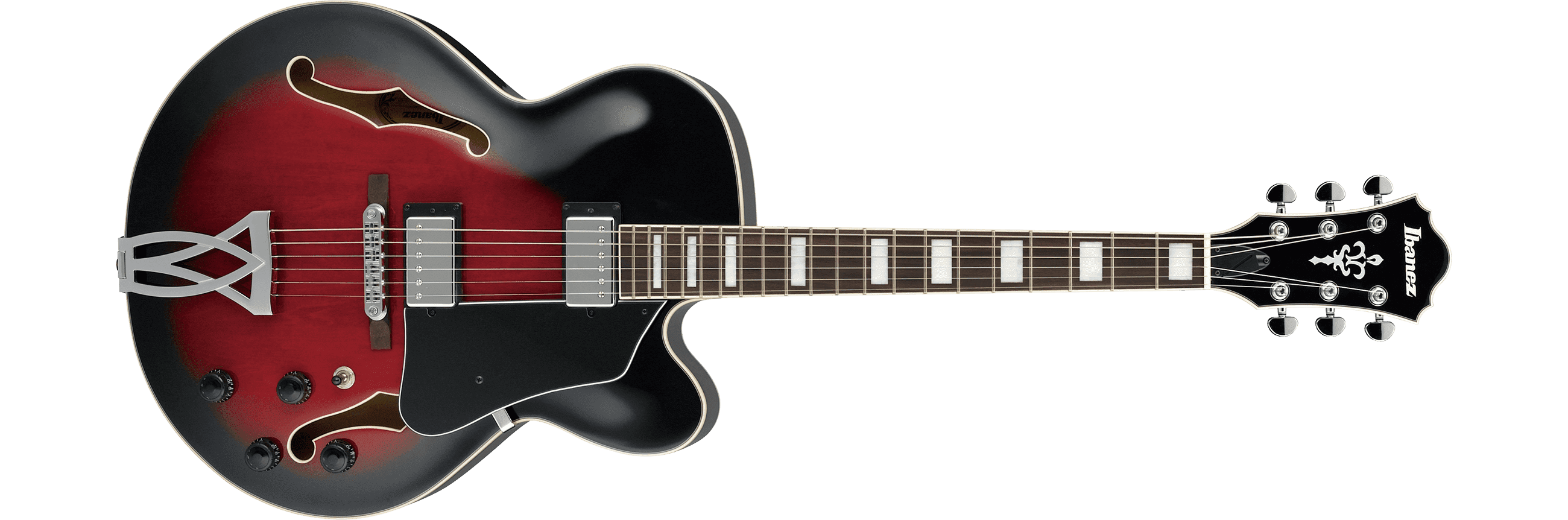 The AF75 features a full-hollow body design with an arched laminated maple top with ƒ holes and ivory multi-binding on maple back and sides with a single Venetian cutaway mated to a set-in mahogany neck with a 20-fret rosewood fingerboard with ivory binding and pearl block position markers. Components include a pair of Ibanez Artcore humbucking pickups with chrome covers and individual volume and tone controls, a Tune-o-matic style bridge on a wooden base, a trapeze tailpiece, a plastic nut, a black pickguard, speed knobs, and Ibanez tuning machines.