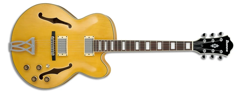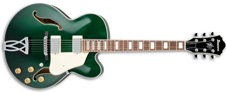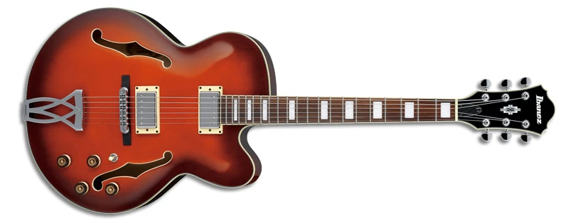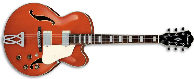 The AF75D features a full-hollow body design with an arched laminated maple top with ƒ holes and ivory multi-binding on maple back and sides with a single Venetian cutaway mated to a set-in mahogany neck with a 20-fret rosewood fingerboard with ivory binding and pearl block position markers. Components include a pair of Ibanez Artcore humbucking pickups with chrome covers and individual volume and tone controls, a Tune-o-matic style bridge on a wooden base, a trapeze tailpiece, a plastic nut, an ivory pickguard and pickup rings, speed knobs, and Ibanez tuning machines.