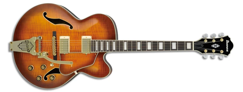 The AF85TDG features a full-hollow body design with a laminated flamed maple top with ƒ holes and ivory multi-binding on flamed maple back and sides with a single Venetian cutaway mated to a set-in mahogany and maple neck with a 20-fret rosewood fingerboard with ivory binding and acrylic block position markers. Components include a pair of Ibanez Artcore humbucking pickups with gold covers and individual volume and tone controls, an ART-2 roller bridge on a wooden base, a vintage-style vibrato tailpiece, a plastic nut, a flamed maple pickguard, Sure Grip III knobs, and Ibanez diecast tuning machines with white half moon buttons.