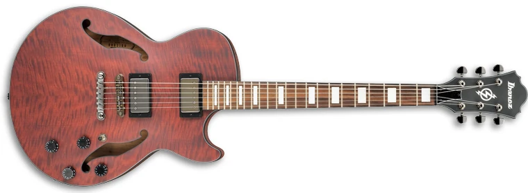 The AGS83BZ mates the single-cutaway body of the AG75 to the semi-hollow construction of the AS73. The AGS83B is a similar model with different fretboard inlays.