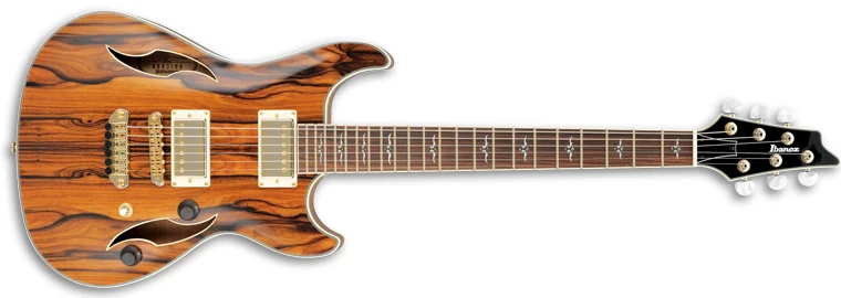 The AJD91C features a small, thin, semi-hollow double-cutaway body design which is somewhat reminiscent in shape to some of the Roadstar II series guitars from the 1980s, such as the RS1010SL. It has a laminated cocobolo top with stylized ƒ holes and cream multi-binding on cocobolo back and sides mated to a set-in mahogany and maple neck with a 22-fret rosewood fingerboard with cream binding and special position markers. Components include dual Ibanez Artcore humbucking pickups with gold covers, an ART-1 Tune-o-matic style bridge, a Quik Change Ultra tailpiece with integrated fine tuners, a plastic nut, rosewood bell knobs, and Ibanez tuning machines with white acrylic half-moon buttons.
