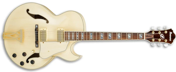 The AK100 features a thick, full-hollow body design with a laminated maple top with ƒ holes and cream multi-binding on maple back and sides with a single pointed Florentine cutaway mated to a set-in maple and walnut neck with a 20-fret rosewood fingerboard with cream binding and abalone split block position markers. Components include dual Ibanez Super 58 Custom humbucking pickups with gold covers and individual volume and tone controls, ivory pickup rings, an ART-W bridge with wooden saddle and base, a VT60 trapeze tailpiece, a plastic nut, a maple pickguard with matching finish, rosewood bell knobs, and Ibanez tuning machines.
