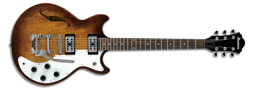 The AMF73T features a smaller, double-cutaway, semi-hollow body design with a flat, laminated maple top with a single ƒ hole on maple back and sides mated to a set-in mahogany neck with a 22-fret rosewood fingerboard with white dot position markers. Components include a pair of Ibanez Classic Elite Retro humbucking pickups with chrome covers and individual volume and tone controls, a roller bridge with a vintage vibrato tailpiece, a large white pickguard covering most of the bottom half of the top, a plastic nut, Sure Grip III knobs, and Ibanez tuning machines.