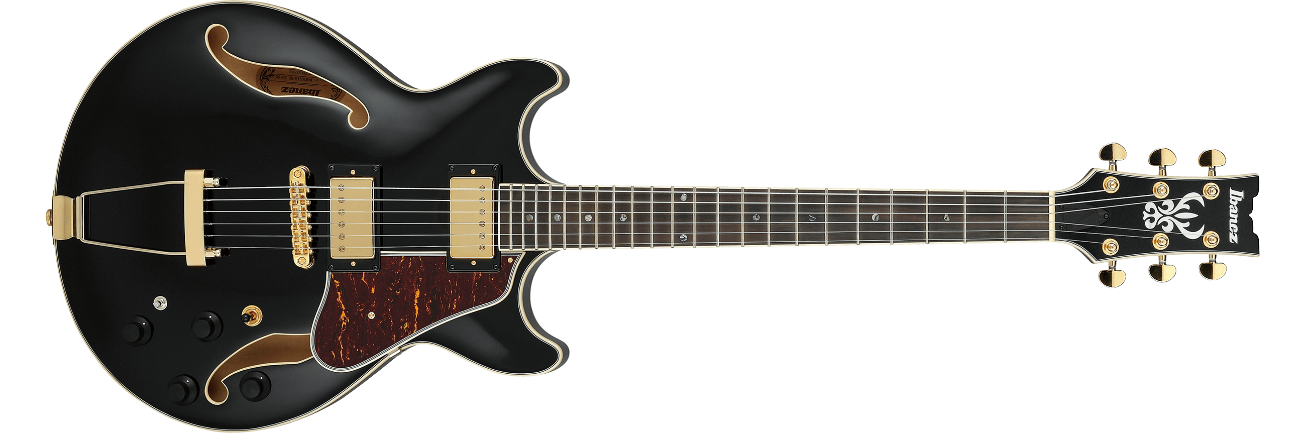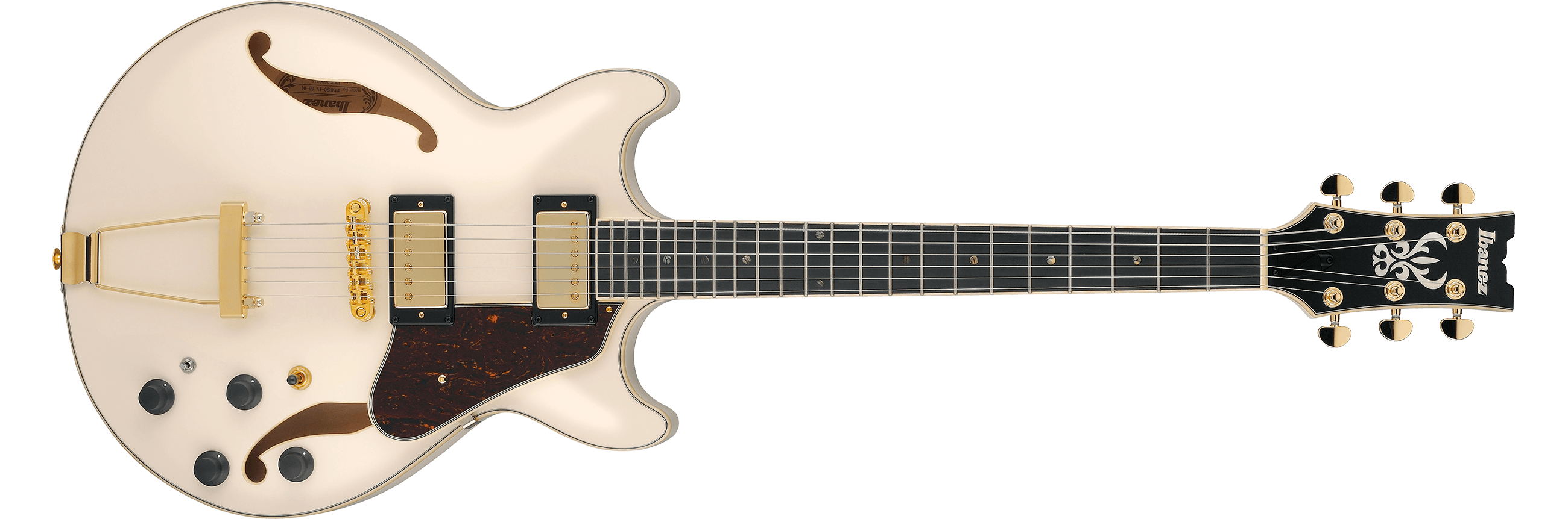 The AMH90 features a compact, full-hollow, double cutaway body design constructed of a laminated linden top with ƒ holes and ivory multi-binding on laminated linden sides and back mated to a set-in nyatoh and maple neck with a 22-fret Macassar ebony fingerboard with ivory binding and acrylic block position markers. Components include a pair of Ibanez Super 58 humbucking pickups with gold covers and individual volume and tone controls, a Gibraltar Performer tune-o-matic style bridge, a trapeze tailpiece, a plastic nut, a red tortoise shell pickguard, Sure Grip III knobs, and Ibanez tuning machines.