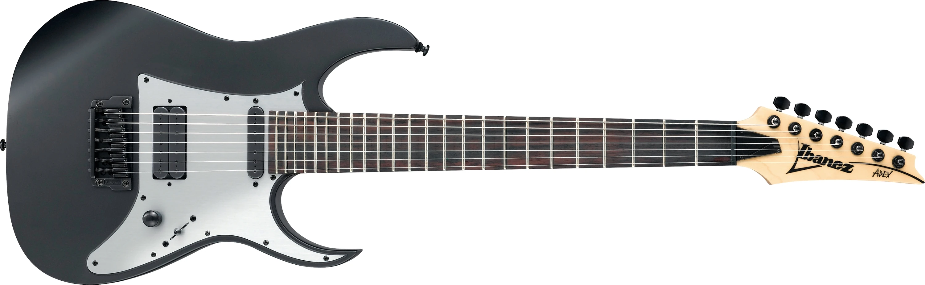 The APEX20 has an RG series basswood body bolted to a maple neck with a 24-fret rosewood fingerboard with no inlays. Components include DiMarzio Blaze pickups with a humbucker at the bridge and a single-coil at the neck mounted in a satin aluminum pickguard and a Gibraltar Standard II-7 hard-tail bridge.