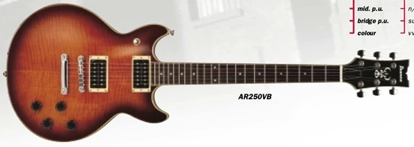 The AR250 is an Artist series solid body electric guitar model introduced by Ibanez in 1999. The AR250 supplanted the AR200 which is similar except it has a plain maple top. It was produced in South Korea by Cort.