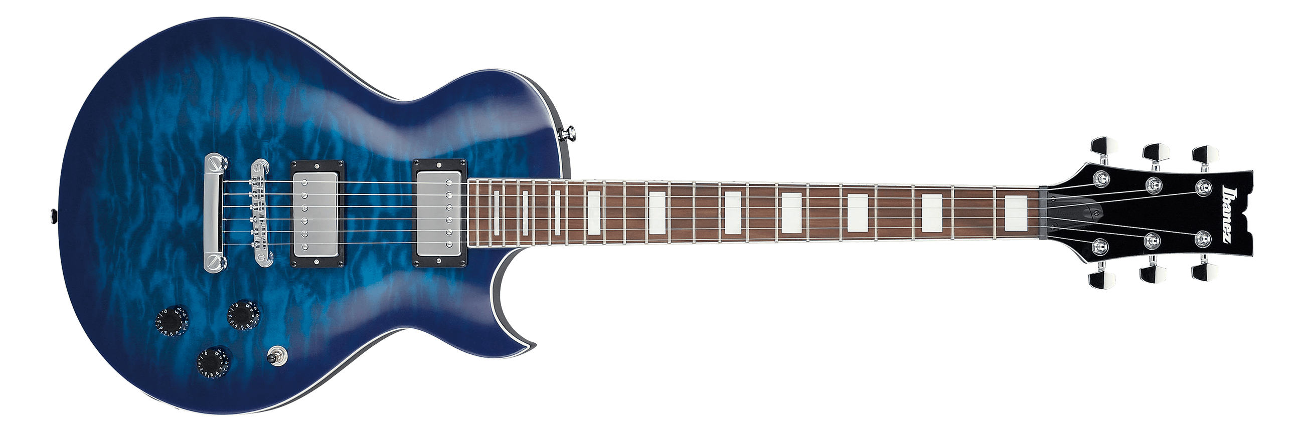 The ART120QA features an art grain quilted maple veneer on a poplar body bolted to a maple neck with a 22-fret treated New Zealand pine fingerboard with binding and a acrylic block position markers. Components include dual Ibanez Infinity R humbucking pickups and a Full Tune III Tune-O-Matic style bridge with tailpiece.