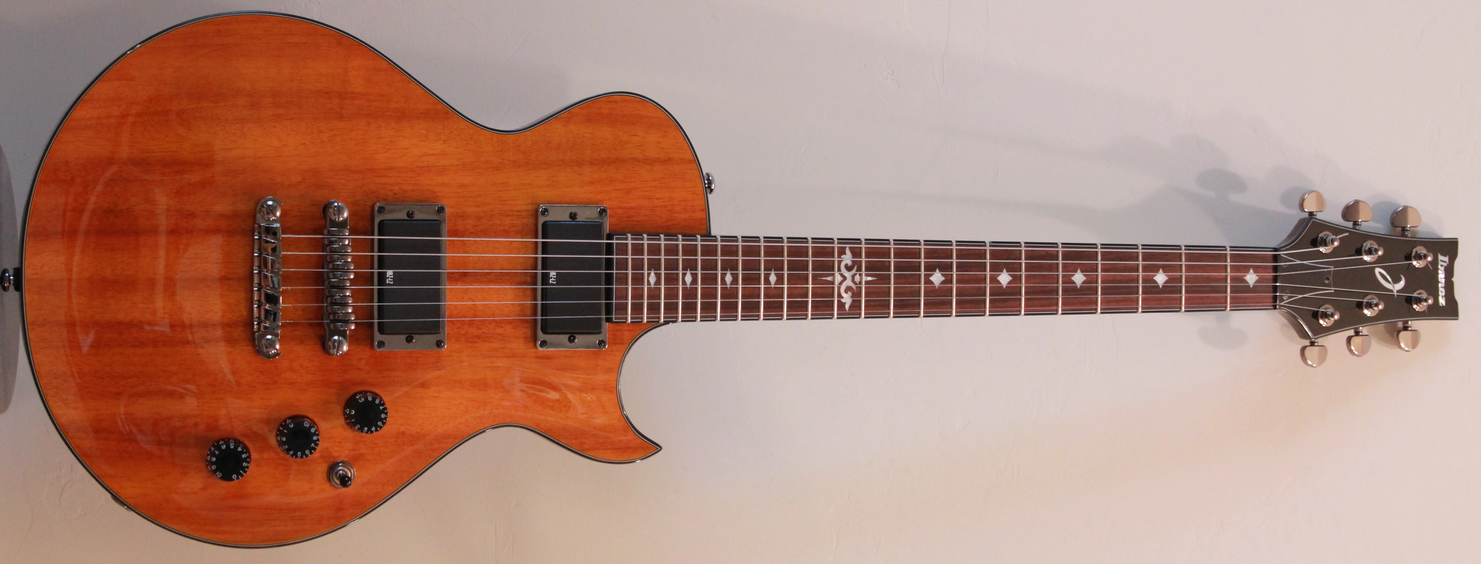 The ART400 features a koa top with black binding on a mahogany body mated to a set-in mahogany neck with a 22-fret rosewood fingerboard with binding and diamond position markers. Components include a Gibraltar III Tune-o-matic style fixed bridge and tailpiec, a pair of Ibanez LoZ active humbucking pickups and black speed knobs.