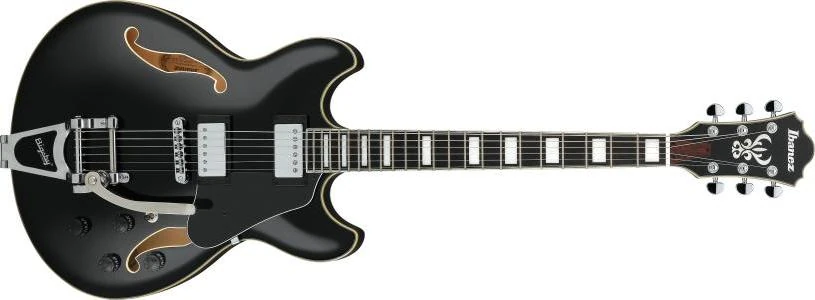 The AS103T features a semi-hollow, double cutaway body design with a maple top with ƒ holes and cream multi-binding on maple back and sides mated to a set-in nyatoh and maple neck with a 22-fret Macassar ebony fingerboard with binding and acrylic and abalone split block position markers. Components include a pair of Ibanez Super 58 humbucking pickups with gold covers and individual volume and tone controls and a Tri-sound switch for the neck, a roller bridge and Bigsby vibrato tailpiece, a bone nut, a black pickguard, Sure Grip III knobs, and Ibanez tuning machines.