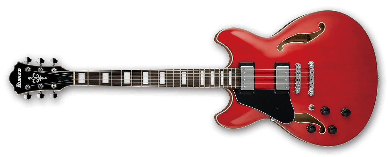 The AS73L features a double-cutaway, semi-hollow body design with an arched laminated maple top with ƒ holes and ivory multi-binding on maple back and sides mated to a set-in mahogany neck with a 22-fret rosewood fingerboard with ivory binding and pearl dot position markers. Components include a pair of Ibanez Artcore humbucking pickups with chrome covers and individual volume and tone controls, a Tune-o-matic style bridge with a Quik Change tailpiece, a plastic nut, speed knobs, and Ibanez tuning machines.