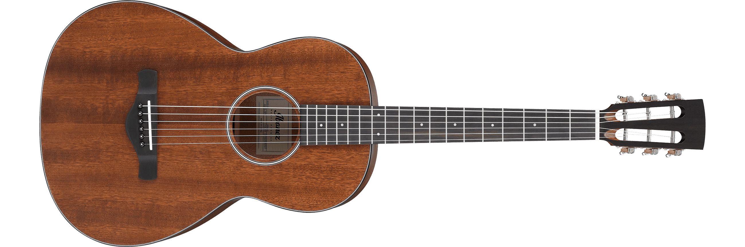The AVN9 features a parlor body shape with a solid Thermo Aged mahogany top with Thermo Aged spruce X bracing and mahogany back and sides with an open pore finish. The soundhole is round with a black and white multi rosette and the top is bordered with a tortoiseshell binding. It has a satin finished soft-V shaped mahogany neck with an 18-fret rosewood fingerboard with white dot position markers. Components include a bone saddle in a rosewood bridge with black Ibanez Advantage bridge pins, a bone nut and a slotted headstock with antique chrome Ibanez open gear tuning machines.