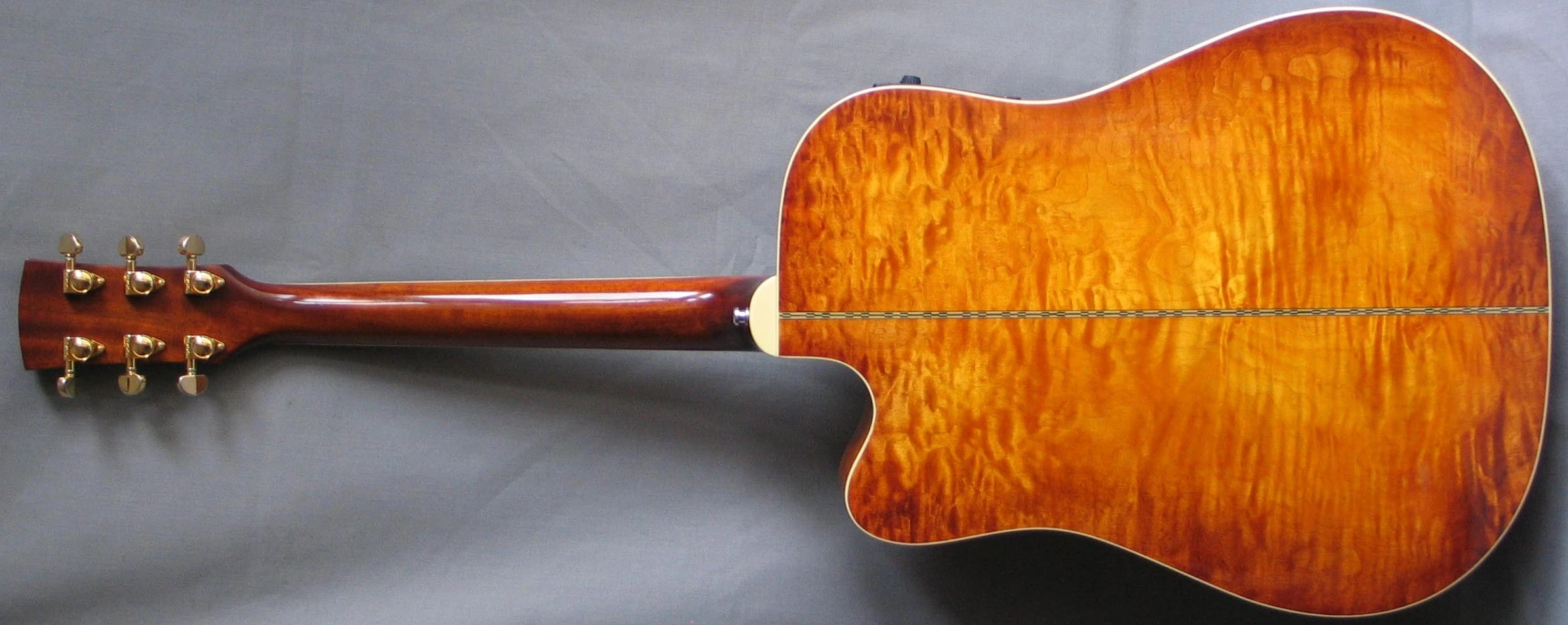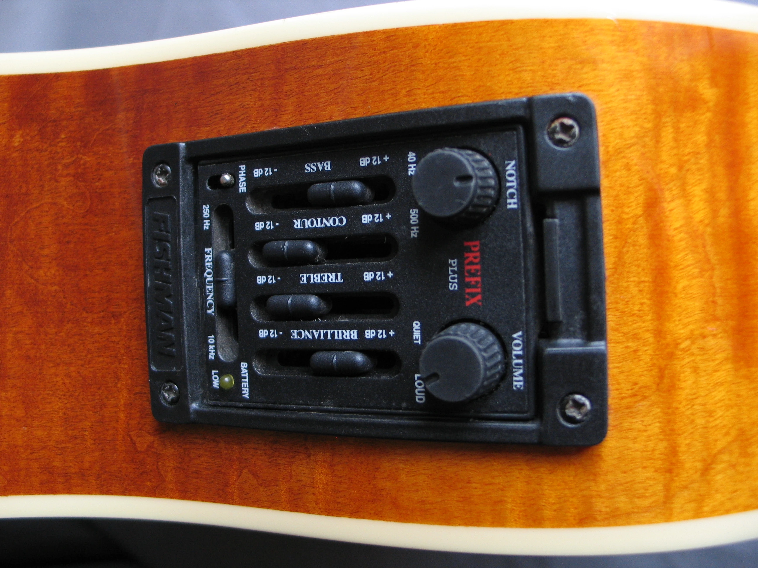 Electronics consist of a Fishman Acoustic Matrix pickup connected to a Fishman Prefix Plus preamp with onboard tuner powered by a 9V battery and a ¼" output.