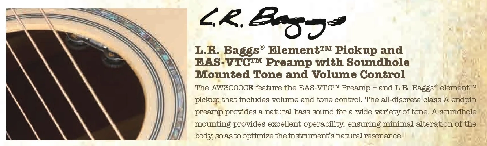 Electronics consist of an L.R. Baggs Element under saddle pickup feeding an L.R. Baggs EAS-VTC preamp powered by a 9V battery and feeding a ¼" endpin output.