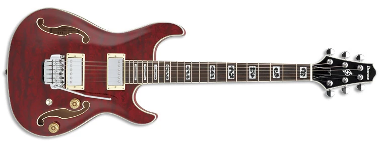 The AWD82T features an arched, laminated bubinga top with ƒ holes and ivory multi-binding on maple back and sides mated to a set-in mahogany and maple neck with a 22-fret rosewood fingerboard with ivory binding and special "Kumogara" cloud design position markers. Components include a pair of Ibanez Artcore humbucking pickups with chrome covers mounted in ivory pickup rings, an ACT two-point knife-edge tremolo bridge, a plastic nut, speed knobs, and Ibanez tuning machines with half moon buttons.