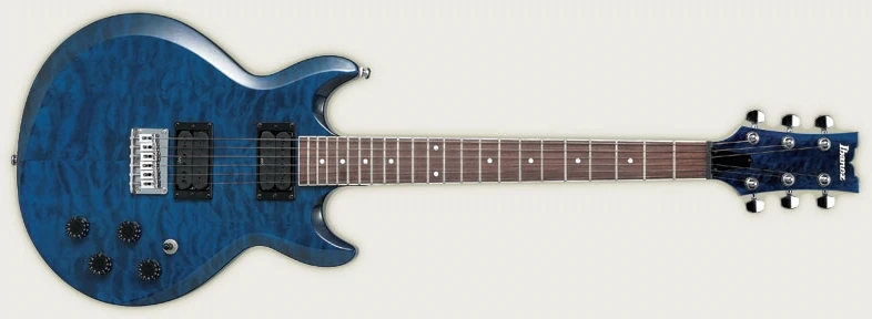 The AX220QM features a quilted maple top on a mahogany body bolted to a maple neck with a 22-fret rosewood fingerboard with binding and dot inlays. Components include dual Ibanez Axis humbucking pickups and a fixed bridge.