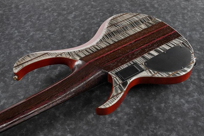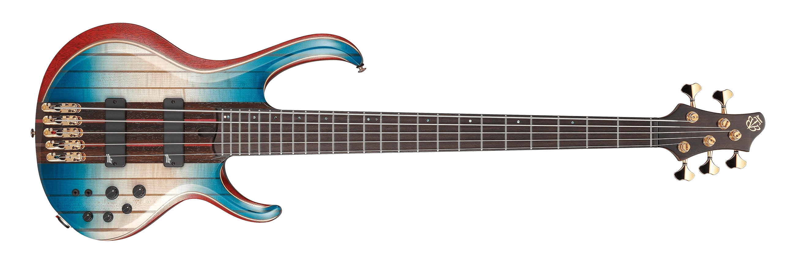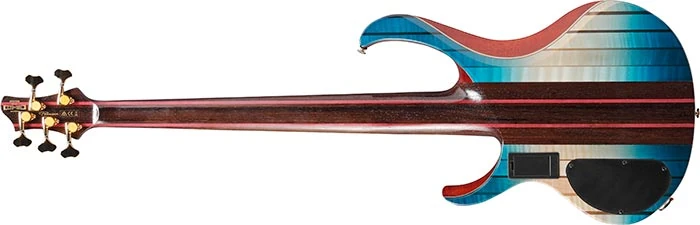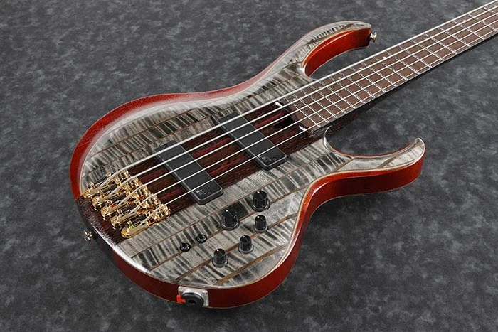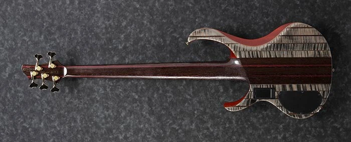 The BTB1935 features neck through body construction with a curly maple top and back on African mahogany wings attached to a graphite reinforced panga panga and purpleheart neck with a 24-fret panga panga fingerboard with binding and offset abalone dot position markers. The body has a double cutaway design with very distinctive, narrow, curving horns. Components include a pair of Aguilar DCB passive pickups channeled through an Ibanez custom preamp with a three-band EQ, stainless steel frets including a zero fret with Premium fret edge treatment, individually mounted Mono-rail VS bridges with adjustable 19mm string spacing, a locking Neutrik stereo output jack, a plastic nut, and Gotoh tuning machines.