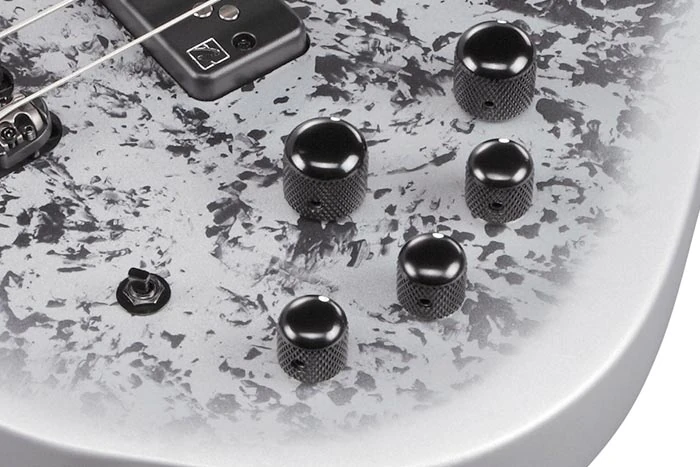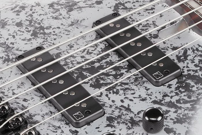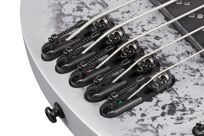 The BTB25th5 features neck through body construction with okume wings attached to a maple and walnut neck with graphite reinforcement rods with a 24-fret rosewood fingerboard with acrylic block position markers. The body has a double cutaway design with very distinctive, narrow, curving horns. Components include a pair of Nordstrand Big Single passive pickups channeled through a Vari-mid III 3-band EQ preamp with EQ bypass switch, individually mounted Mono-rail Vs bridges with adjustable 19mm string spacing, a locking Neutrik stereo output jack, a plastic nut, and Ibanez die-cast tuning machines.
