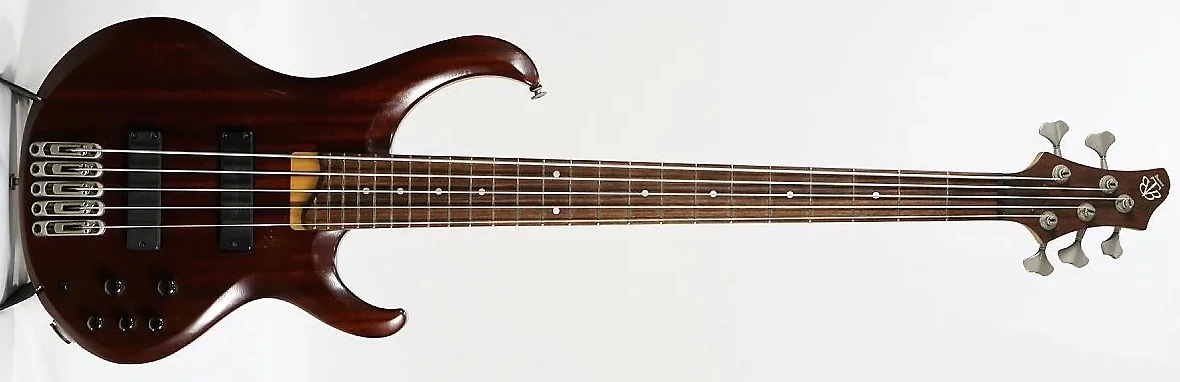 The BTB515E features mahogany body bolted to a maple and bubinga neck with a 24-fret rosewood fingerboard with pearl dot position markers and white side dots. The body has a double cutaway design with very distinctive, narrow, curving horns. Components include a pair of Bartolini® Custom passive pickups with a Bartolini ITMB 3-band preamp EQ with bypass switch, large frets, Mono-rail bridges with 19mm string spacing, a locking Neutrik stereo output jack, a graphite nut and gotoh tuning machines.