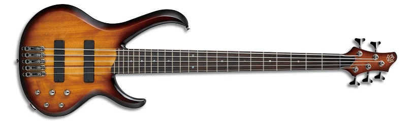 The BTB575 features neck through body construction with mahogany wings attached to a maple and bubinga neck with a 24-fret rosewood fingerboard with abalone dot position markers. The body has a double cutaway design with very distinctive, narrow, curving horns. Components include a pair of Bartolini MK2 passive pickups with a Bartolini preamp with a three-band EQ powered by two 9V batteries, individually mounted Mono-rail II bridges with 19mm string spacing, a locking Neutrik stereo output jack, a plastic nut, and Ibanez tuning machines.