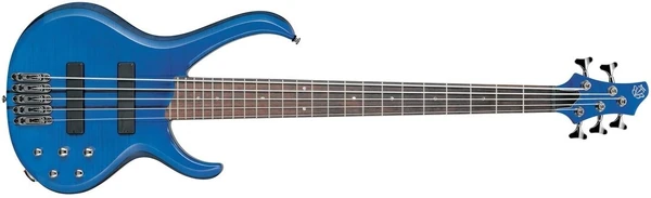 The BTB575FM features neck through body construction with figured maple top on a mahogany body attached to a maple and bubinga neck with a 24-fret rosewood fingerboard with pearl dot position markers. The body has a double cutaway design with very distinctive, narrow, curving horns. Components include a pair of Bartolini® MK2-5 passive pickups with a Bartolini® MK2 three-band EQ preamp, medium frets, Mono-rail bridges with 19mm string spacing, a locking Neutrik stereo output jack, a plastic nut and die-cast tuning machines.