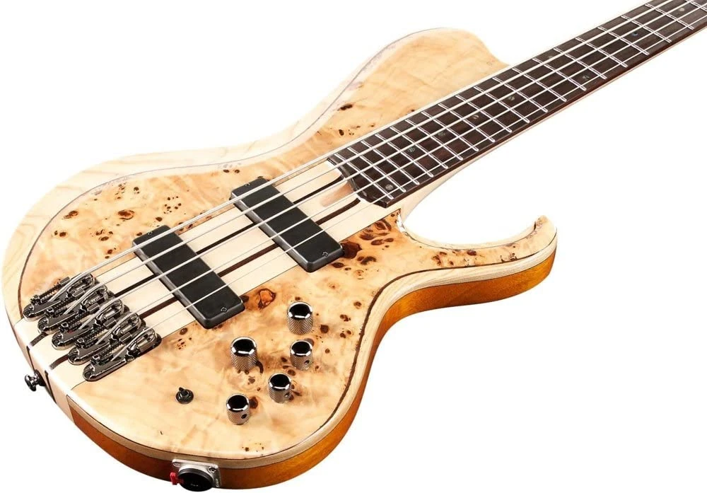 The BTB845SC "Terra Firma" features neck through body construction with a poplar burl top and mahogany back on ash wings attached to a maple and walnut neck with a 24-fret rosewood fingerboard with abalone dot position markers. The body has a single cutaway design with a very prominent upper bout and a narrow, curving lower horn. Components include a pair of Bartolini BH2 passive pickups with an Ibanez custom preamp with a three-band EQ, stainless steel frets including a zero fret, a finger ramp which matches the top, Mono-rail bridges with 19mm string spacing, a locking Neutrik stereo output jack, a plastic nut and Ibanez tuning machines.