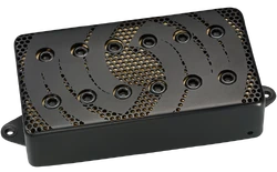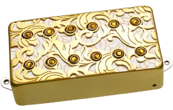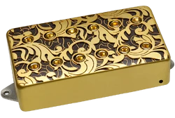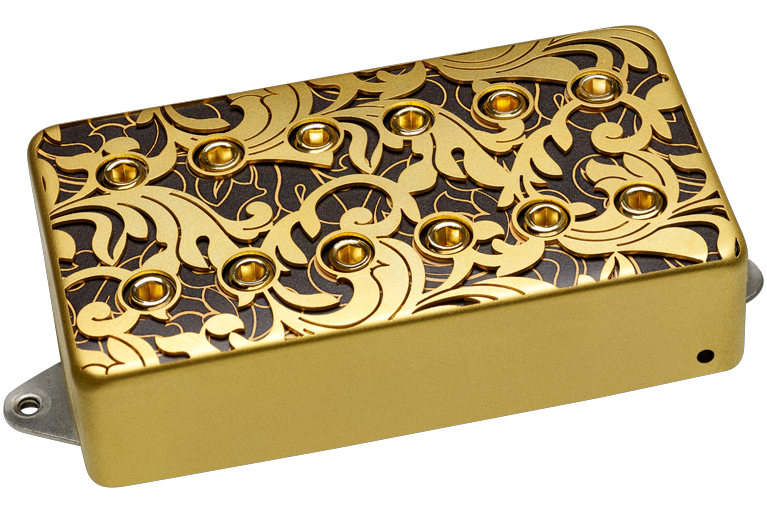 "Designed for Steve Vai’s signature Ibanez PIA guitar, the UtoPIA Bridge pickup features a custom, laser cut baroque style cover over a gold patterned layer.