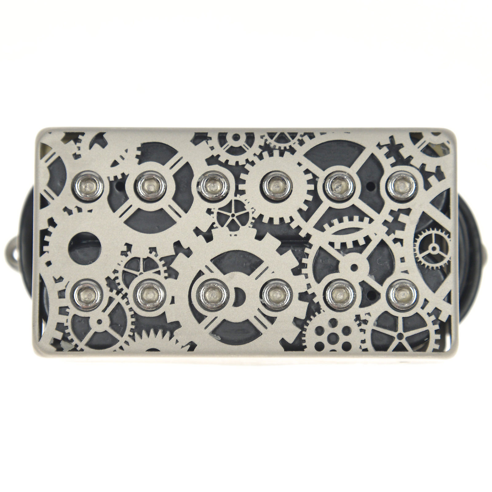 It features a laser-cut pickup cover with interlocking gear patterns.[28]
