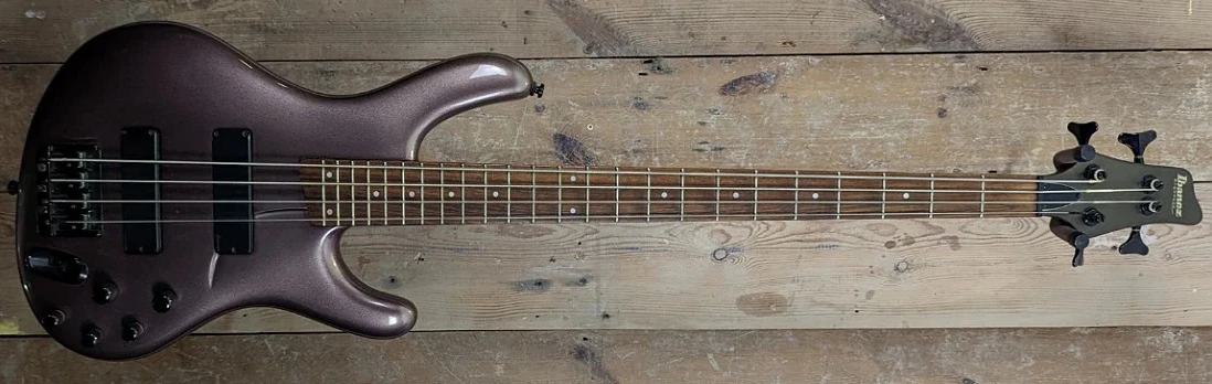 The EDB500 features a ergonomic shaped double-cutaway luthite body with curved back and scooped front bolted to a maple neck with a 24-fret rosewood fingerboard with pearl dot position markers, side dots, and a plastic nut. Components include a set of Ibanez DXH pickup's on the neck and bridge positons with a Phat EQ, a standard solid bridge with 19mm string, Ibanez Die-cast machine heads and chrome hardware.