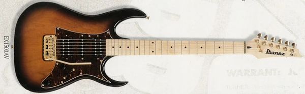 This EX1500 features a light American maple body mated to a one-piece maple neck with a traditional neck joint with a metal plate. It has a 22-fret maple fingerboard with dot position markers. The pickups, which are mounted in a pickguard, are Ibanez Powersound humbuckers in the bridge and neck positions flanking a single coil. Other components include a synchronized tremolo bridge.