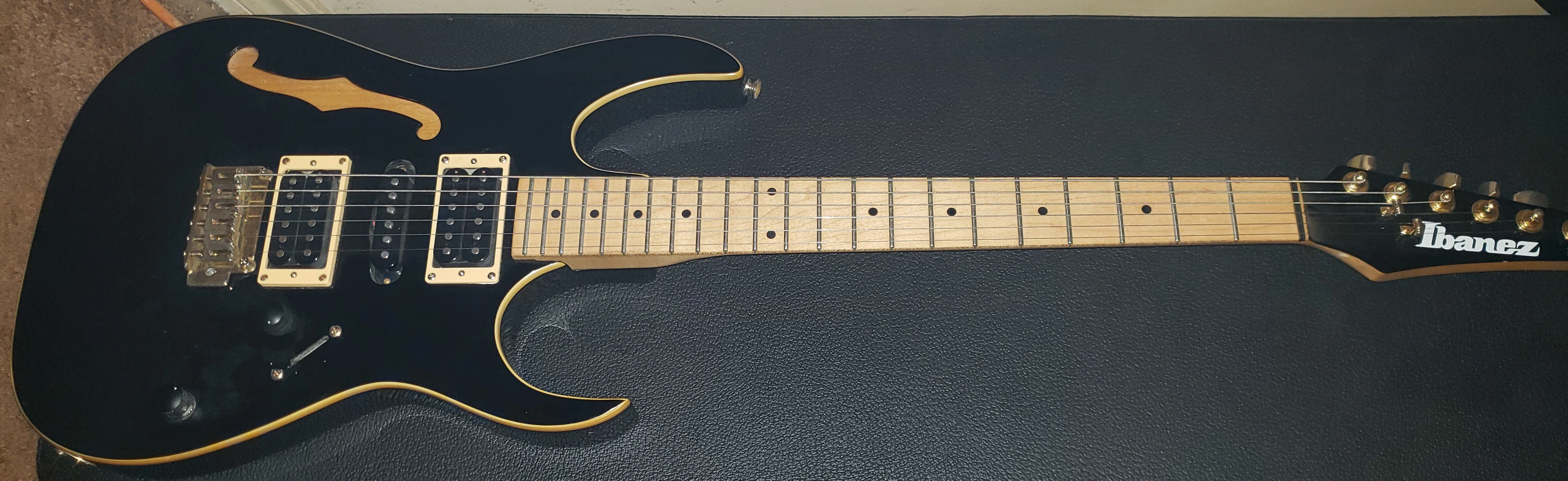 This EX1700F a chambered light American maple body with cream binding and an f-hole cutout above the bridge bolted to a maple neck with a traditional neck joint with a metal plate. It has a 22-fret maple fingerboard with dot position markers. The pickups are Ibanez Powersound humbuckers in the bridge and neck positions flanking a single coil. Other components include a synchronized tremolo bridge.