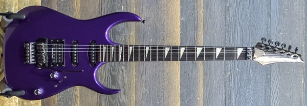 The EX360 features a solid wood body bolted to a one-piece maple neck with a 22-fret rosewood fingerboard with triangle position markers. Components include Ibanez pickups with a humbucker in the bridge position and single coils at the neck and middle positions, a double locking tremolo bridge, and a locking nut.