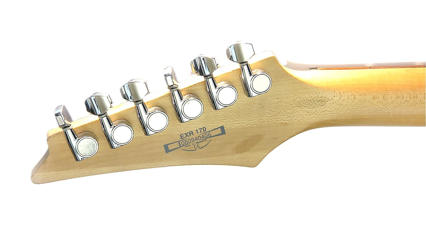 The EXR170 features a maple neck with a 22-fret rosewood fingerboard with dot inlays. It employs an HSH pickup configuration with humbucking pickups in the bridge and neck position and a single coil in the middle. Components include a synchronized tremolo bridge and Ibanez Infinity pickups.