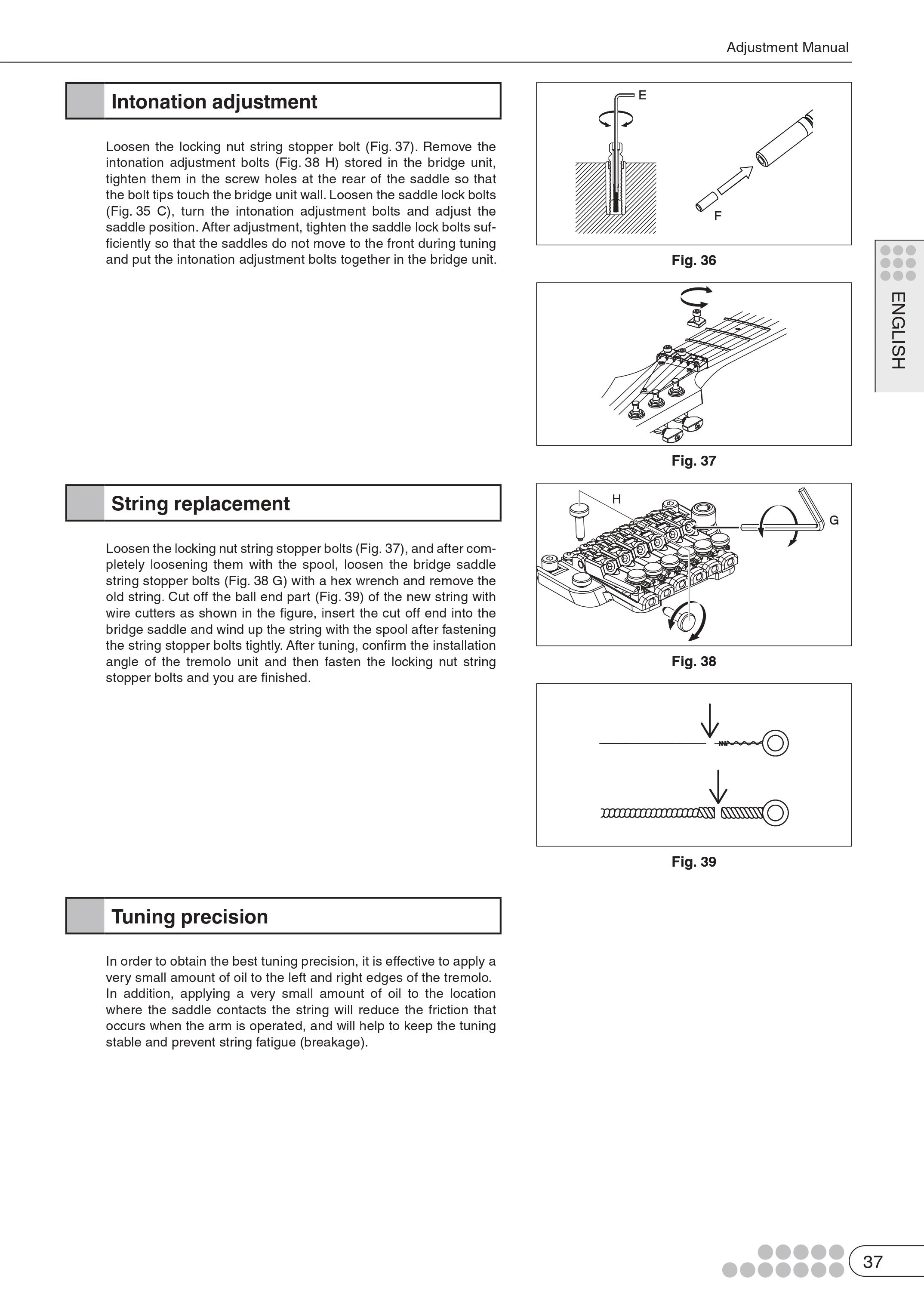 Like all double locking tremolos, the Edge Zero is designed to be use with a locking nut which anchors the strings at the headstock. Fine tuners attached to each saddle allow the player to adjust tuning once the nut is locked down. The saddles can be moved fore and aft to set intonation of each string. The entire bridge can be adjusted up and down in the cavity to adjust the string action by raising or lowering the studs. There is no allowance for adjusting the height of individual strings. Instead the base plate is built in a way so that the saddle heights match the radius of the fretboard.