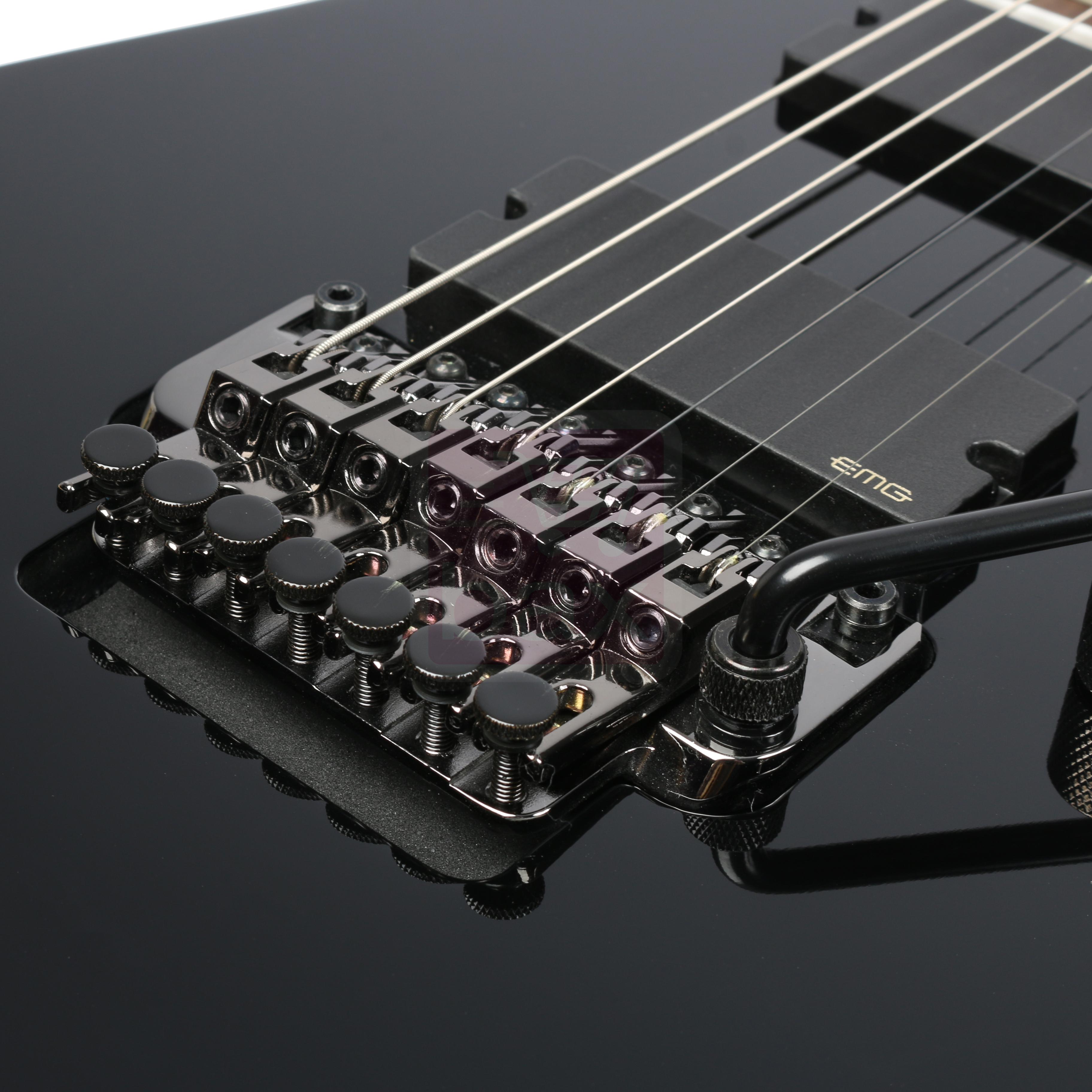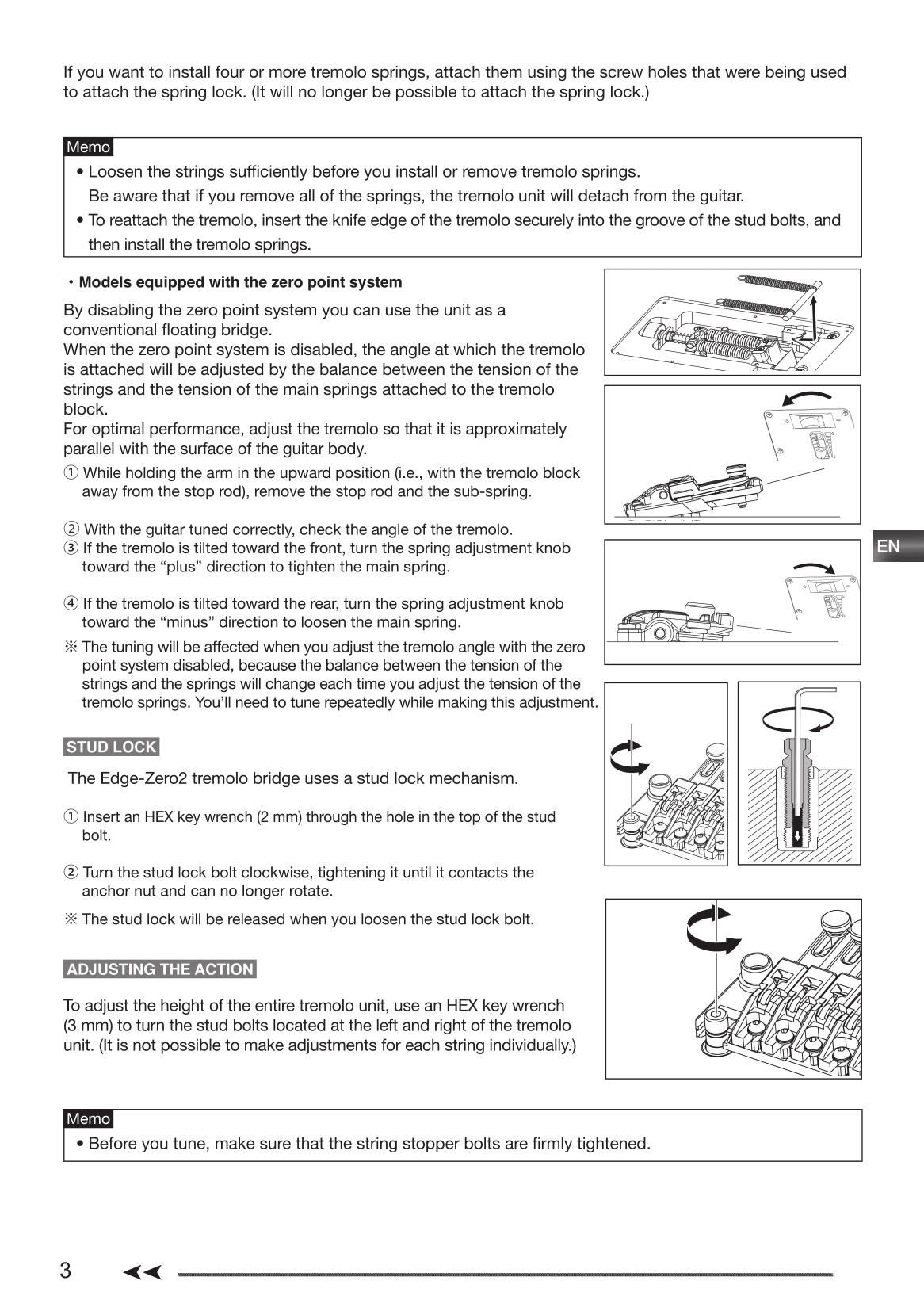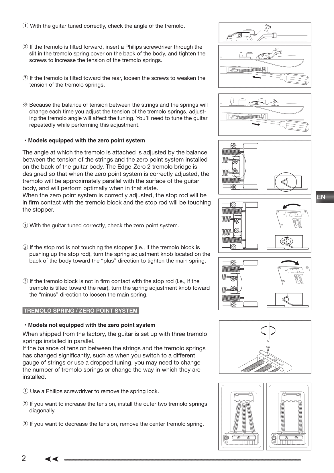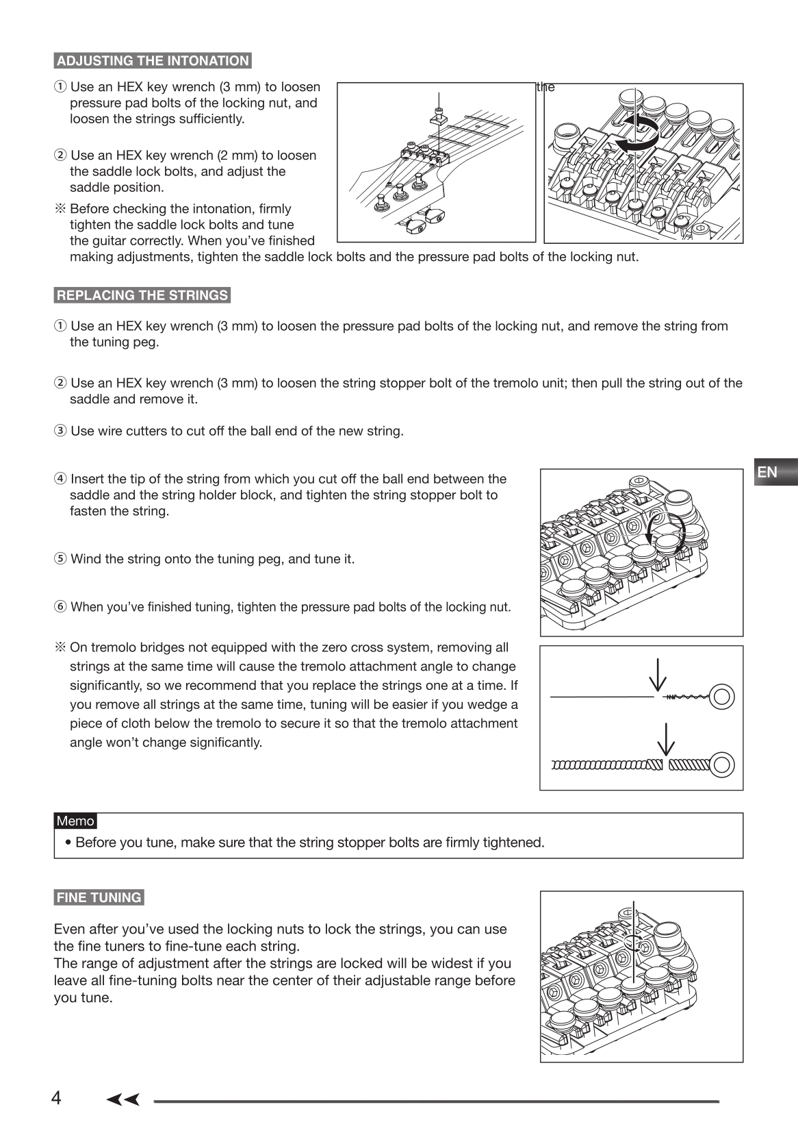 Like all double locking tremolos, the Edge Zero II is designed to be use with a locking nut which anchors the strings at the headstock. Fine tuners attached to each saddle allow the player to adjust tuning once the nut is locked down. The saddles can be moved fore and aft to set intonation of each string. The entire bridge can be adjusted up and down in the cavity to adjust the string action by raising or lowering the studs. There is no allowance for adjusting the height of individual strings. Instead the base plate is built in a way so that the saddle heights match the radius of the fretboard.