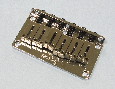 The fixed bridge consists of a steel plate which is bent upwards at the rear which is attached to the guitar top with five screws. Each string is routed through the guitar body and guided by an individual steel saddle. Each saddle can be adjusted back and forth to achieve proper intonation using a screw and spring running through the back of the bridge plate. The height of each saddle is adjustable with a pair of screws at the saddle's leading edge.