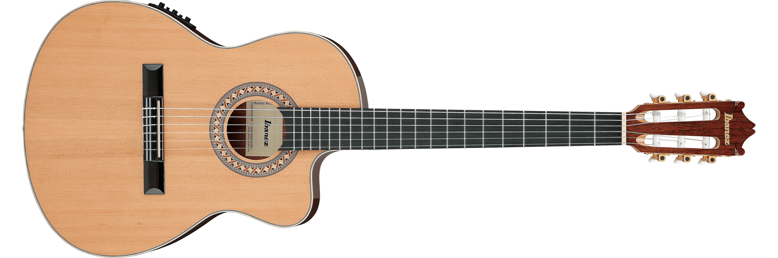 The GA34STCE's electronics consist of an Ibanez under saddle pickup mated to an AEQ210T preamp with onboard tuner powered by a 9V battery and feeding balanced XLR and ¼" stereo outputs.