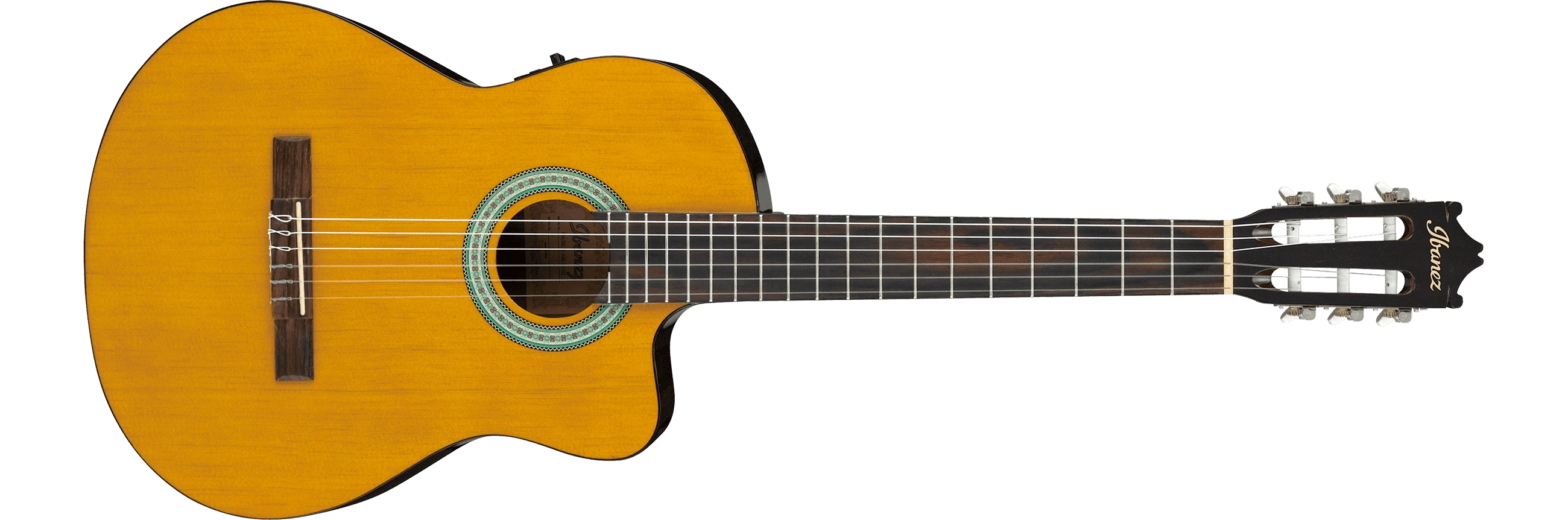 The GA3ECE features a classical body with a Venetian cutaway and a laminated spruce top on agathis back and sides with a gloss finish. The soundhole is round with a classical mosaic water slide decal. It has a mahogany neck with a 19-fret rosewood fingerboard. Components include an Ivorex II plastic saddle in a rosewood bridge, an Ivorex II nut, chrome classical tuning machines with pearl buttons and nylon strings. Electronics consist of an Ibanez under saddle pickup running into an AEQ200T preamp with an onboard tuner powered by a 9V battery and a ¼" stereo output.