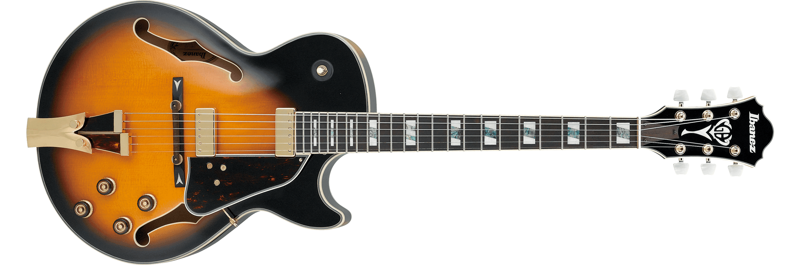 The GB10SE features a smallish, single cutaway, full hollow body design constructed of a laminated spruce top with ƒ holes and multi-layer binding on laminated maple sides and back. The set-in three-piece maple neck sports a large headstock and a 22-fret ebony fingerboard with binding and pearl/acrylic and abalone split block position markers. Components include a pair of floating Ibanez GB special humbucking pickups with individual volume and tone controls, a height-adjustable ebony bridge, a special adjustable split trapeze tailpiece, a bone and brass nut, and a tortoise pickguard.