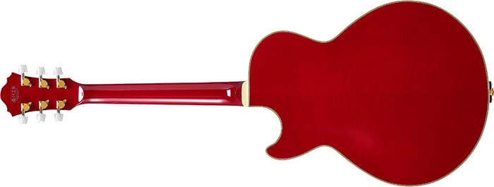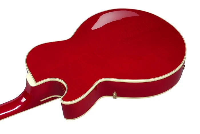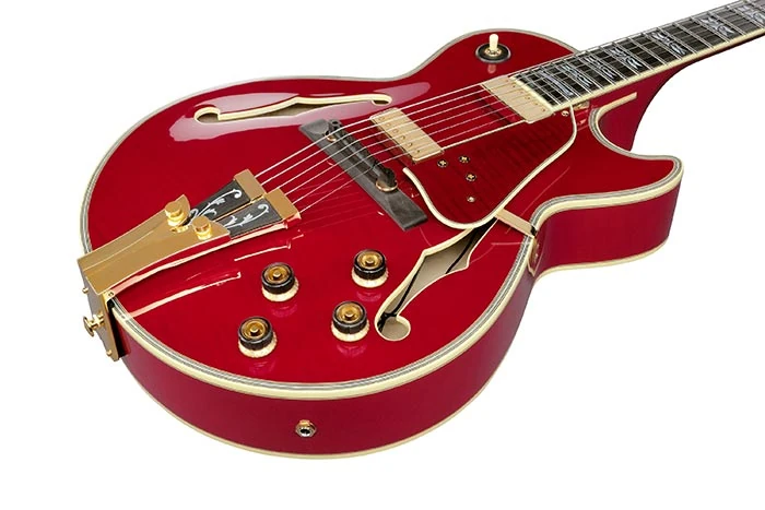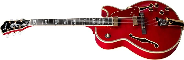 The GBSP10 features a mid-sized, single cutaway, full hollow body design with a spruce top with ƒ holes and multi-layer binding and maple back and sides mated to a set-in three-piece maple neck with a large headstock and a 22-fret ebony fingerboard with binding and pearl/acrylic and abalone split block position markers. Components include dual, floating Ibanez GB special humbucking pickups with individual volume and tone controls; a special height-adjustable ebony bridge with special adjustable split trapeze inlaid tailpiece; a bone and brass nut; and a red flamed maple pickguard.