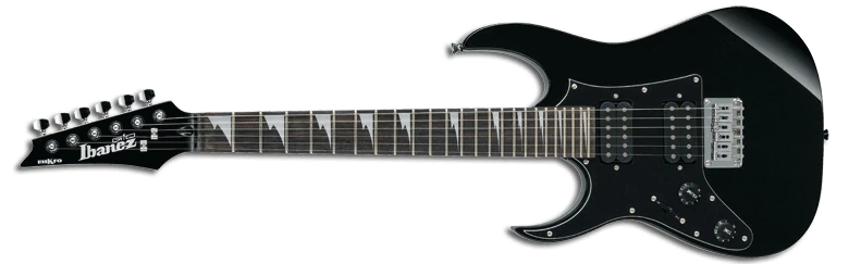The GRGM21L features a solid wood body (see specs for specific species) bolted to a maple neck with a 24-fret fingerboard with sharktooth position markers. Components include dual Ibanez humbucking pickups and a fixed bridge.