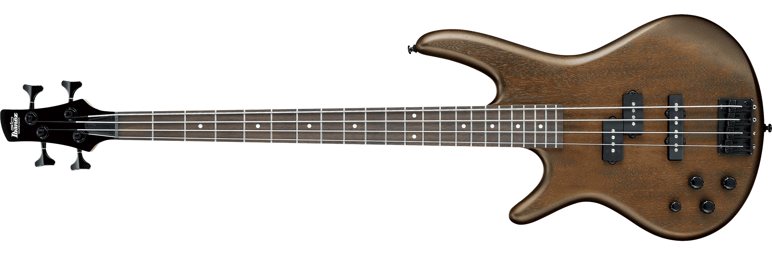 The GSR200BL features a double-cutaway mahogany body bolted to a maple neck with a 22-fret rosewood fingerboard with white dot position markers. Components include a pair of Ibanez Powersound passive pickups with a Jazz pickup at the bridge and a Precision pickup at the neck, a Standard bridge with 19mm string spacing, a plastic nut and Ibanez tuning machines.