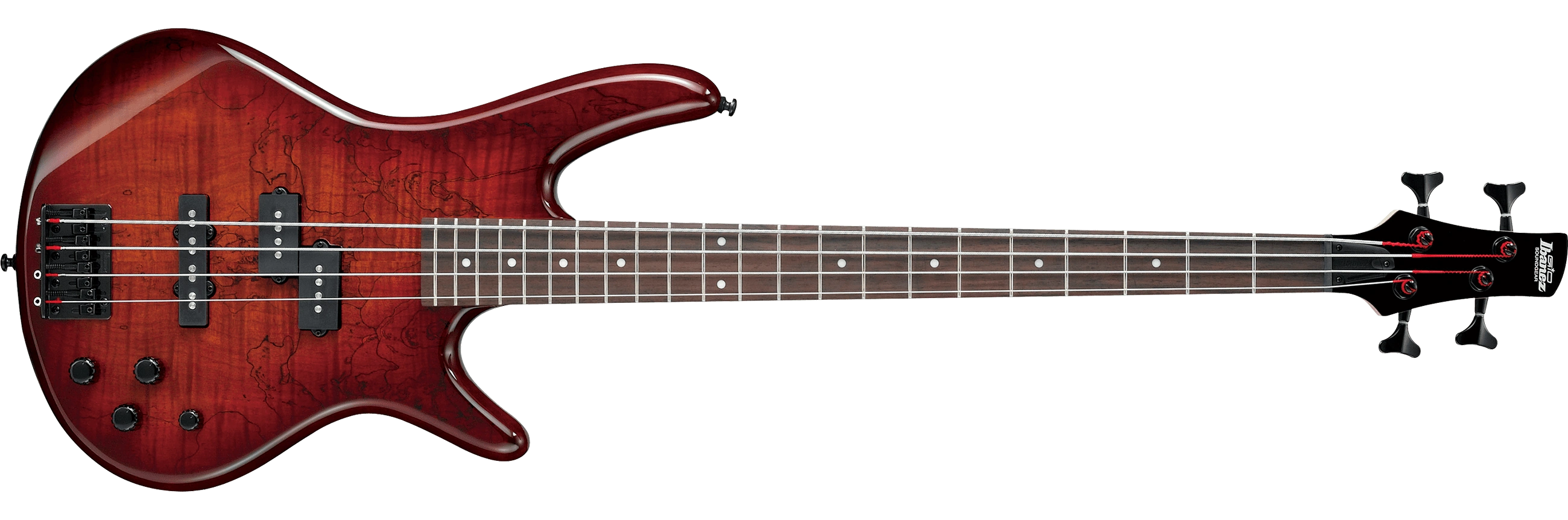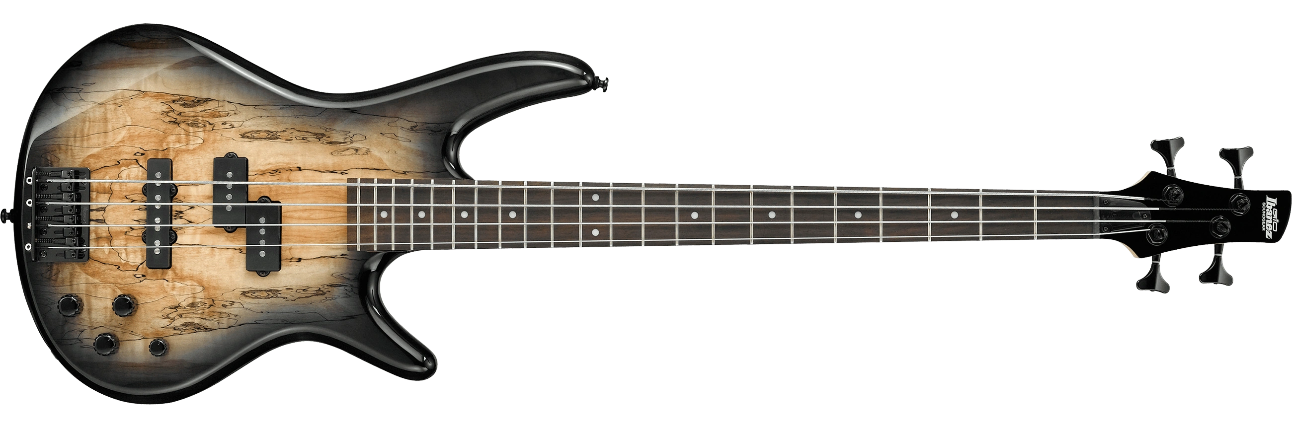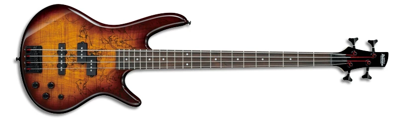 The GSR200SM features a spalted maple top on a double-cutaway agathis body bolted to a maple neck with a 24-fret rosewood fingerboard with white dot position markers. Components include a pair of Ibanez passive pickups with a Jazz pickup at the bridge and a Precision pickup at the neck, a B10 bridge with 19mm string spacing, a plastic nut and Ibanez tuning machines.