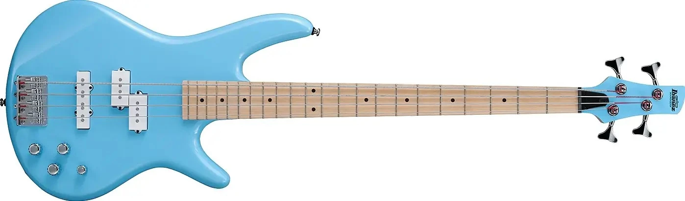 The GSR250M features a double-cutaway agathis body bolted to a maple neck with a 22-fret maple fingerboard with black dot position markers. Components include a pair of Ibanez PSNDJ (P/J) pickups channeled through an active Phat II EQ, a B10 fixed bridge with 19mm string spacing, a plastic nut, Ibanez tuning machines and chrome hardware.